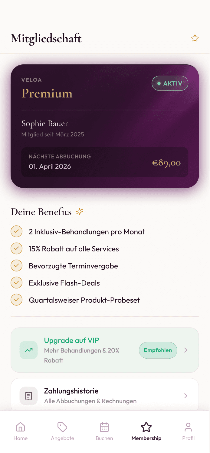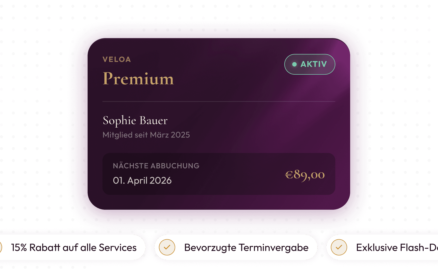 Mit Veloa bietest du flexible Mitgliedschaften mit monatlichen Abonnements an. Deine Kunden profitieren von exklusiven Vorteilen und Prioritätsbuchungen, du von Einnahmen die jeden Monat verlässlich kommen.