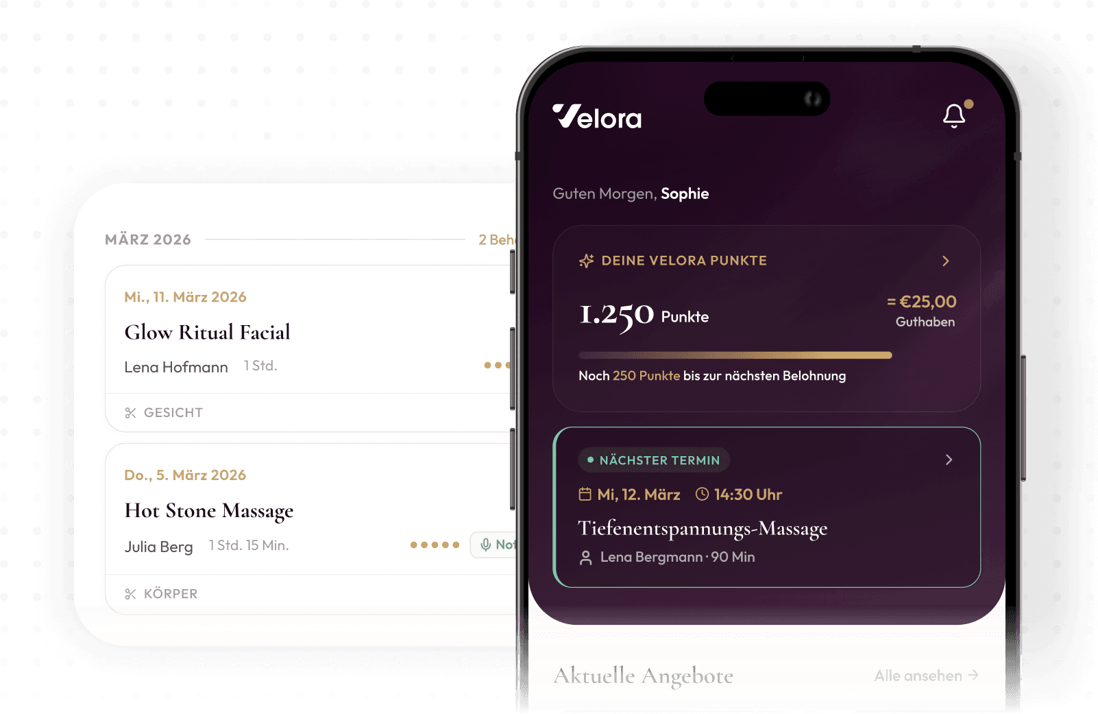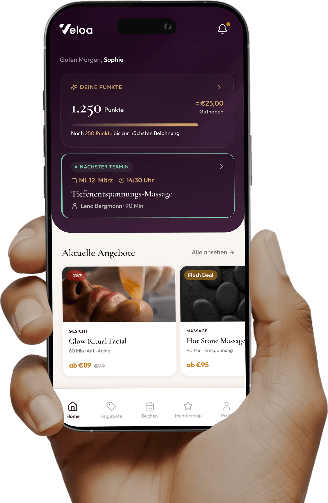 Die meisten Kunden kommen nach dem ersten Besuch nie wieder, weil kein digitaler Kanal zwischen den Terminen existiert. Veloa löst genau das: Buchungen, Kundenbindung und automatische Erinnerungen laufen vollständig über deine eigene App. Du sparst täglich Stunden an Verwaltung, gewinnst planbare Einnahmen durch Memberships und holst Kunden zurück, bevor sie abspringen.