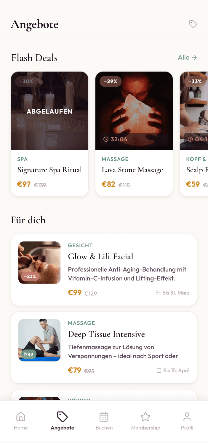 Lege deine Behandlungen, Mitgliedschaften und Flash Deals direkt im Dashboard an. Jede Änderung ist sofort live in deiner App, ohne Wartezeit.