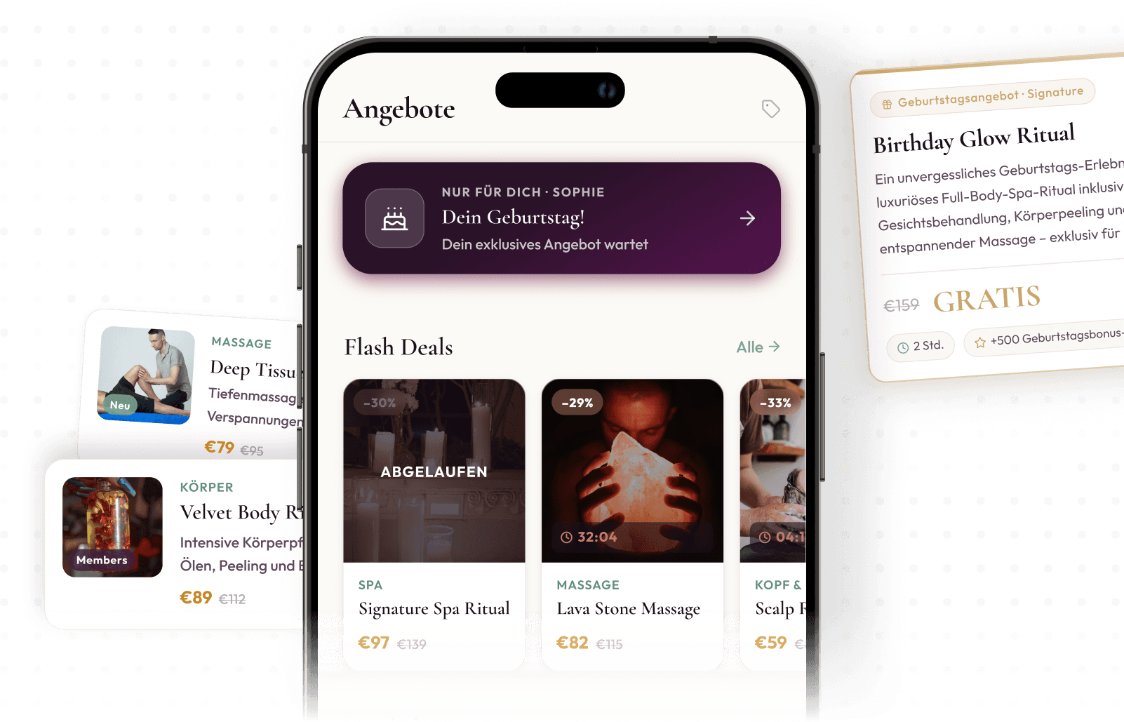 Deine Kunden buchen, sammeln Punkte und erhalten personalisierte Angebote direkt über deine App. Du gewinnst Stammkunden, die von selbst wiederkommen, ohne dass du aktiv nachfassen musst.