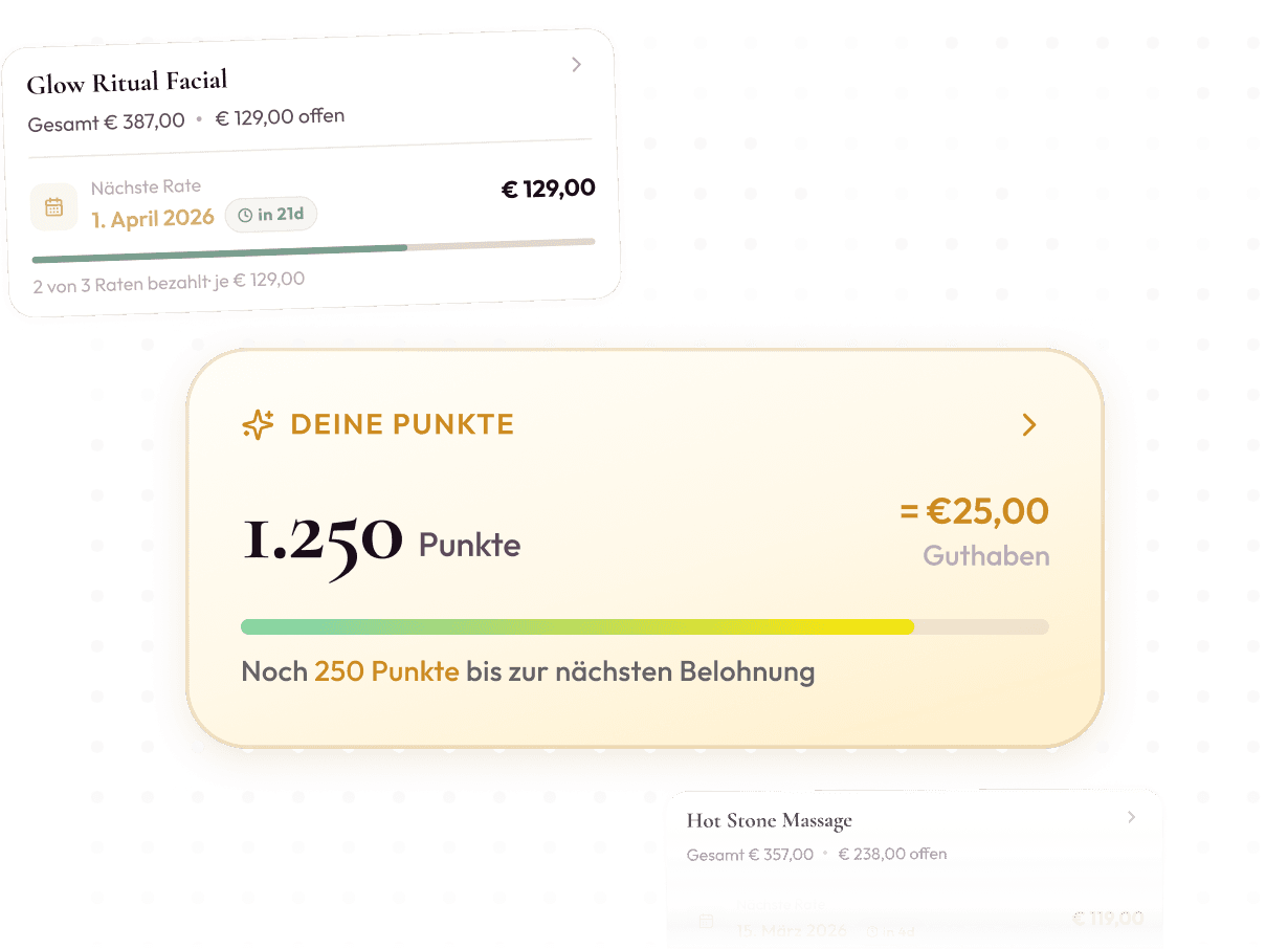 Deine Kunden sammeln automatisch Punkte für jeden Besuch und jede Buchung und lösen sie direkt gegen Behandlungen und Vorteile ein.